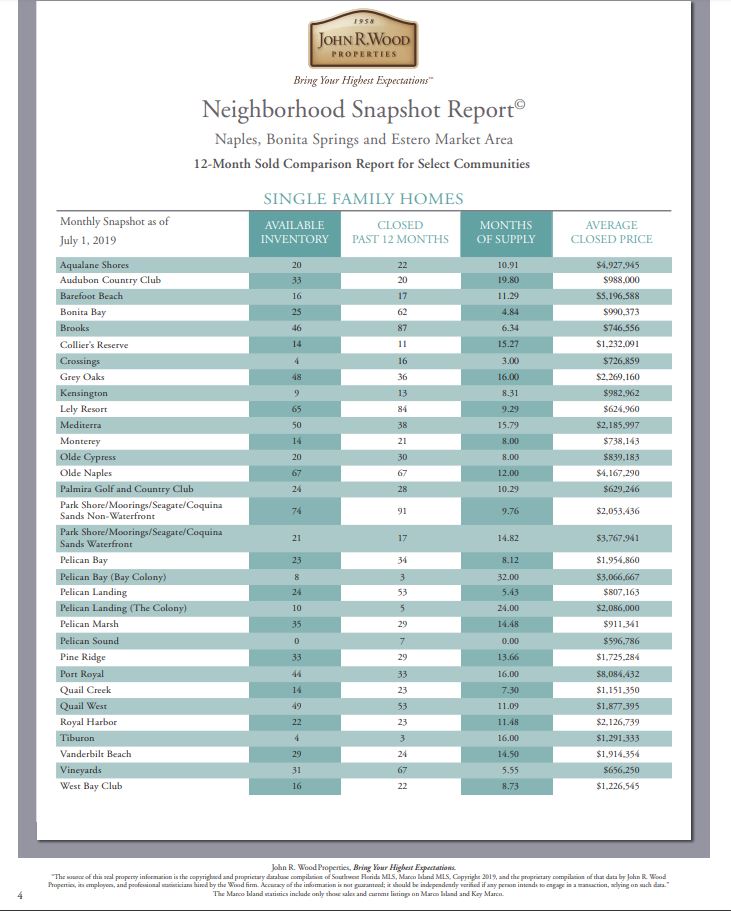 With 825 closings during the 12 months ending June 30, 2019, sales for the Marco Island area were static compared to the preceding 12-month period.